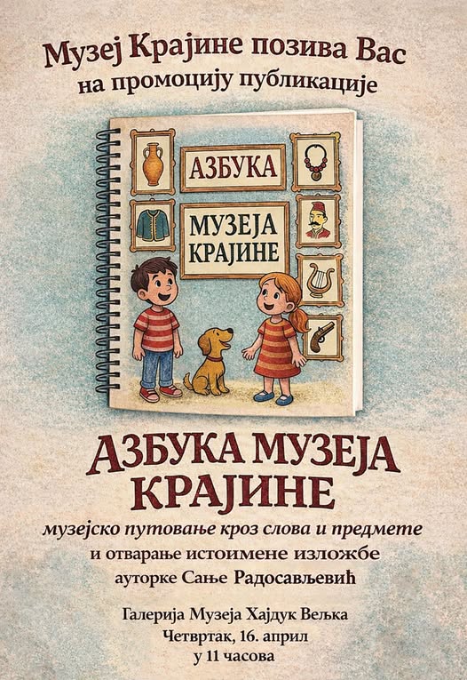 Музеј Крајине у четвртак, 16. априла, организује промоцију публикације „Азбука Музеја Крајине: музејско путовање кроз слова и предмете“ и отварање истоимене изложбе, ауторке Сање Радосављевић, кустоса педагога нашег музеја. Публикација води децу у свет музеја, где свако слово открива једну причу, један предмет, један део богатог културног наслеђа Неготинске Крајине.